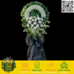 Kệ hoa chia buồn kết hợp lan trắng và cúc trắng mang ý nghĩa “Lòng Thành Hiếu Kính – Tiễn Người Thanh Cao”.